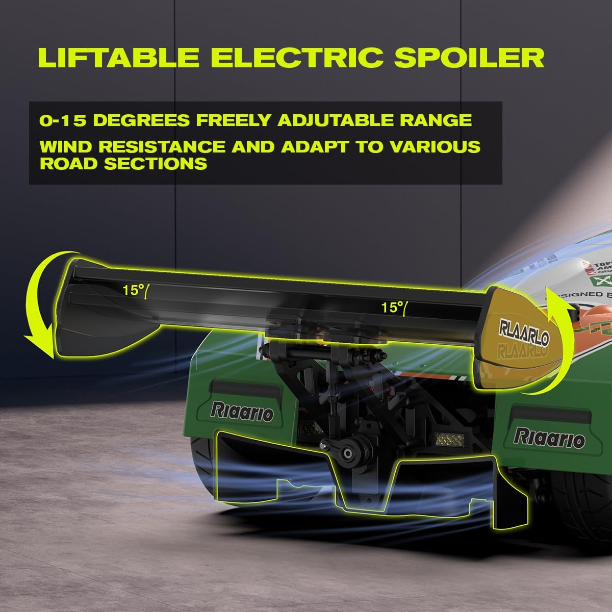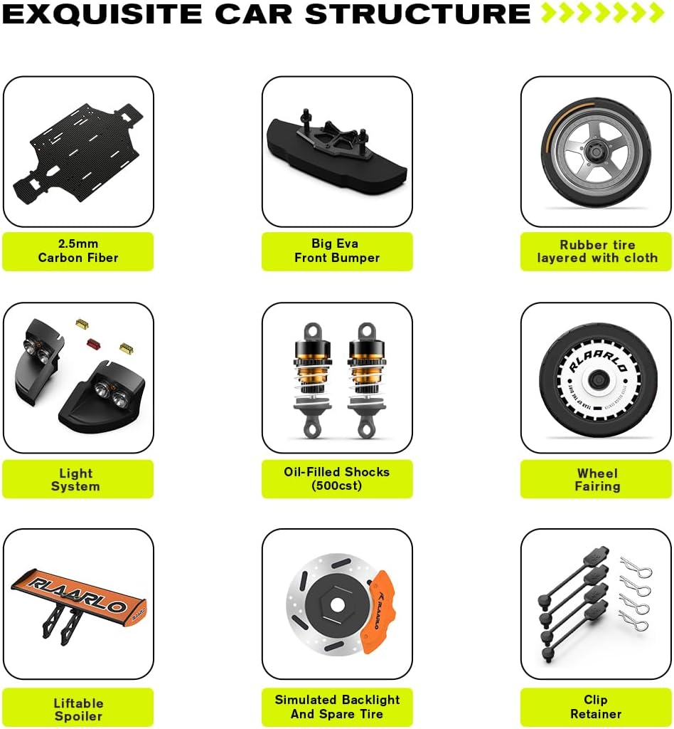 The pre-painted green polycarbonate body features a non-specific supercar design with six LED lights for nighttime visibility, though the lack of real-world scale realism may disappoint collectors. The 2.5mm carbon fiber chassis and triangular upper deck enhance durability, but the plastic body is prone to cracking under high-impact crashes. Aluminum wheels and adjustable motor mounts allow gear ratio tweaks (52T–78T spur gears included), but tire wear is notable on abrasive surfaces like pavement. The suspended independent gearbox reduces impact stress, yet the foam bumper may deform during aggressive bashing. Abundant accessories, including extra gears and stickers, support personalization, but the absence of a gyro limits out-of-box drift performance.