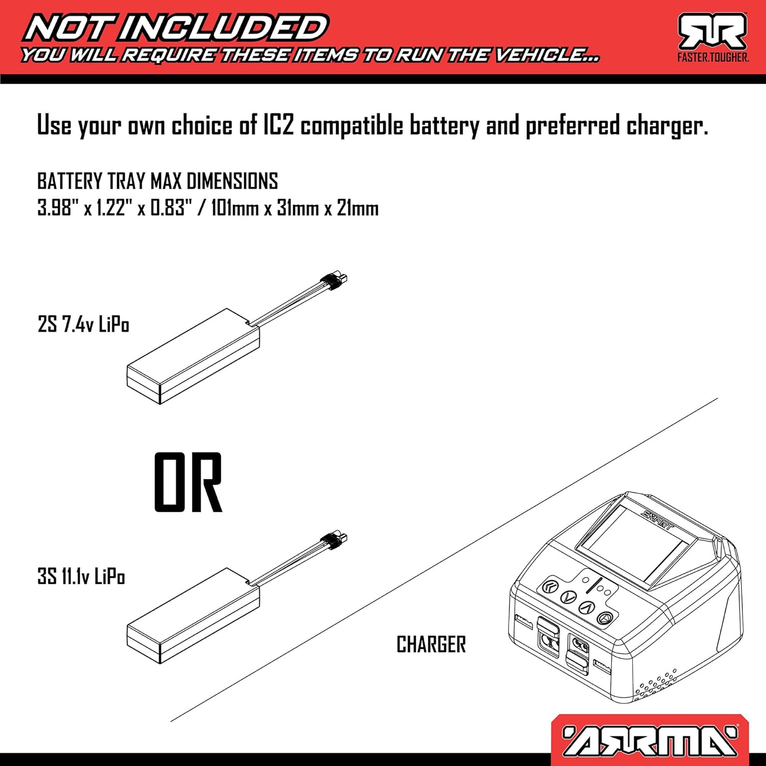 - Battery & Charger: Not included (supports 2S or 3S LiPo)