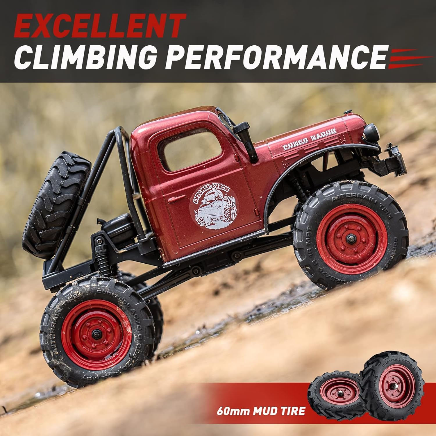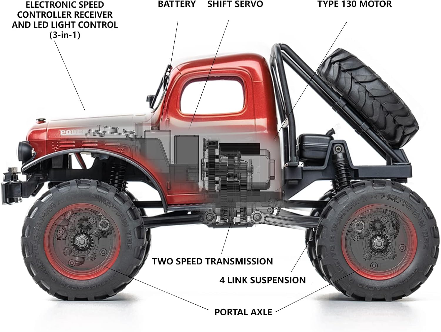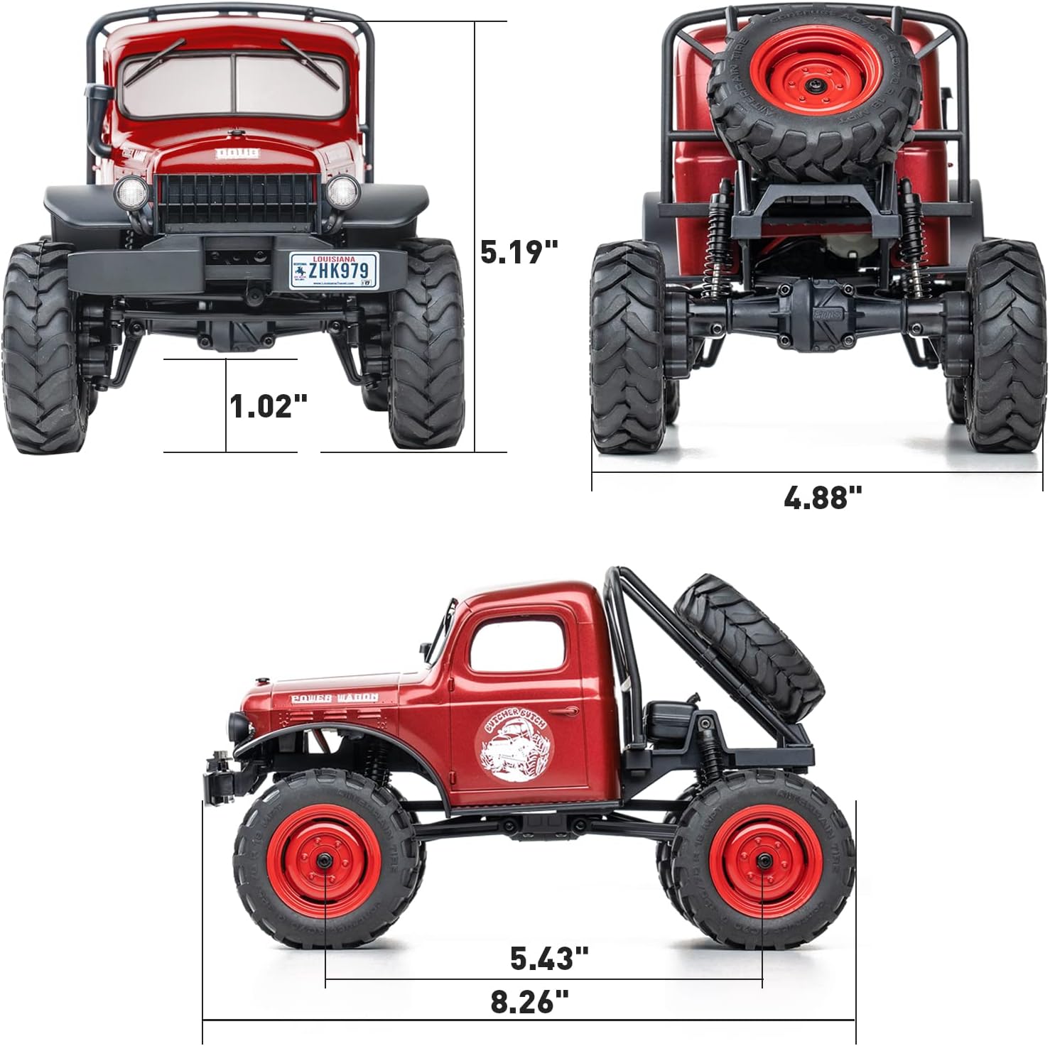 Special Notes: This is a Ready-to-Run model, fully assembled with a pre-painted red Dodge Power Wagon body, LED lights, and a 7.4V 380mAh LiPo battery with USB charger included. Suitable for beginners with proportional controls, while advanced users can add aftermarket parts like brass links or tires for enhanced crawling.