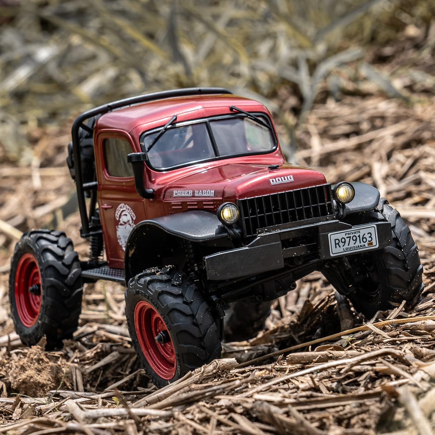 The officially licensed 1949 Dodge Power Wagon body features a detailed red polystyrene shell with a quick-release design for easy access. The nylon-integrated frame ensures durability, while the scale details, like the etched grille and hood supports, enhance realism. LED headlights and taillights improve visibility for low-light crawling, though the lighting system lacks side markers for full effect. The portal axles and metal gear servo add robustness, but the lightweight chassis may tip on steep inclines without added weights. Extensive aftermarket support, including brass upgrades, allows customization for enhanced performance. The electronics are not fully waterproof, requiring caution in wet conditions.,