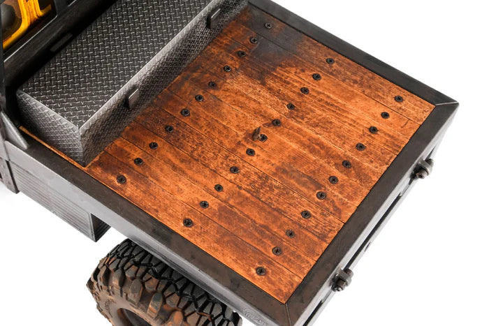 This model pays tribute to the iconic Unimog design, complete with a functional front bumper, scale accessories, and realistic body lines. The rusted "Woodlander" finish is intentionally distressed, giving it a post-apocalyptic look. LED-ready light buckets and soft rubber tires on beadlock wheels enhance both realism and performance. The weathering details, grille, and windshield mesh elevate its visual impact on any scale trail course.