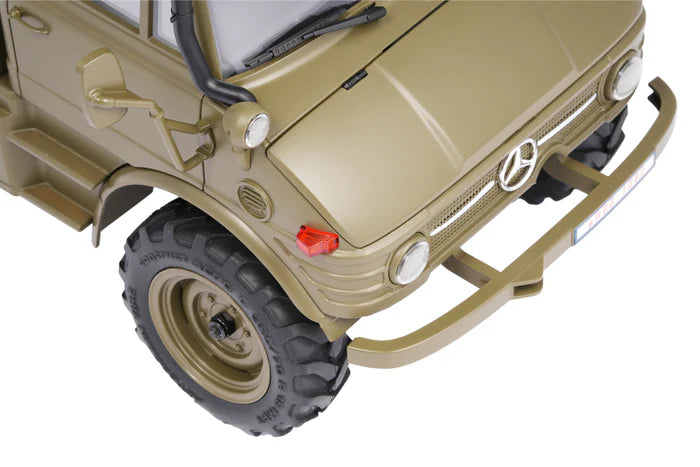 Featuring a hard plastic body with an iconic Unimog grille, raised mirrors, snorkel, and orange warning lights (LEDs not included), the camouflage-style green paint and faux-wood cargo bed (which opens on three sides) bring exceptional scale authenticity. A realistic dashboard and seating detail in the cab add the finishing touches to its rugged aesthetic.