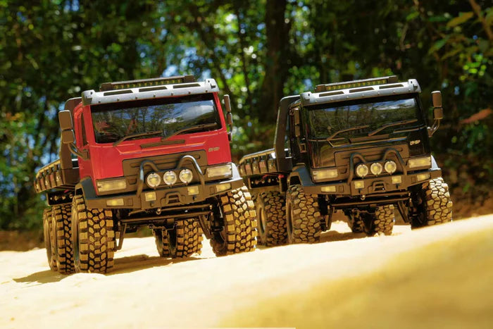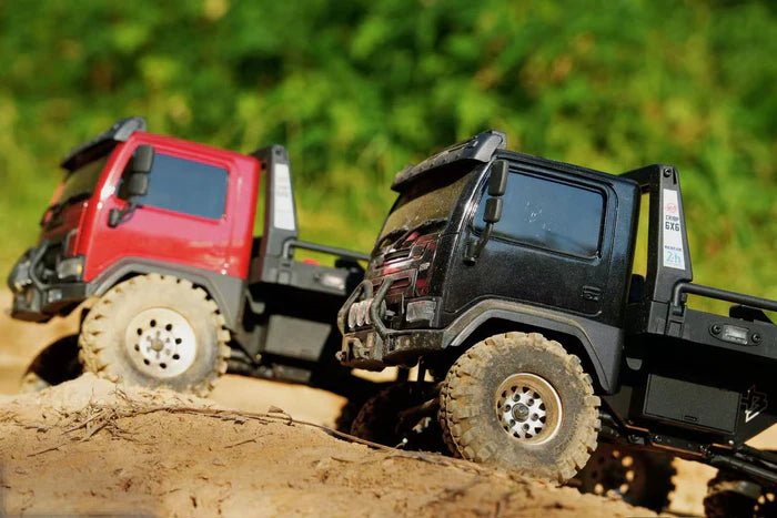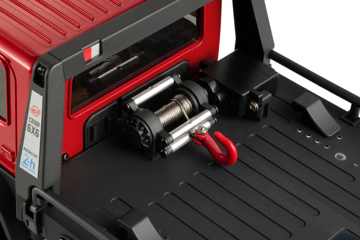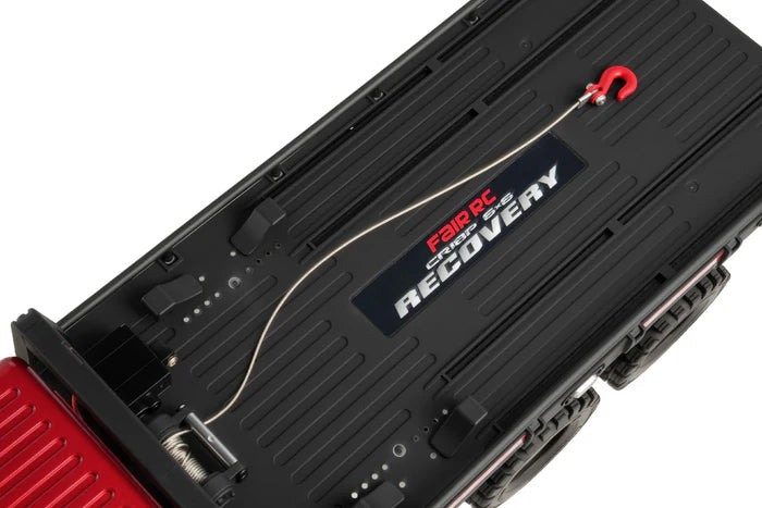 The FairRC CR18P Arktos 1/18 6x6 Ready-to-Run RC Flatbed Truck is a scale model for off-road hauling and crawling, featuring a pre-painted red body with functional accessories. This RC semi truck includes a 2-speed transmission, portal axles, and a winch, supporting tasks like loading and climbing. Its 2.4GHz transmitter and 7.4V LiPo battery make it suitable for hobbyists interested in remote control trucks for trail driving or display.