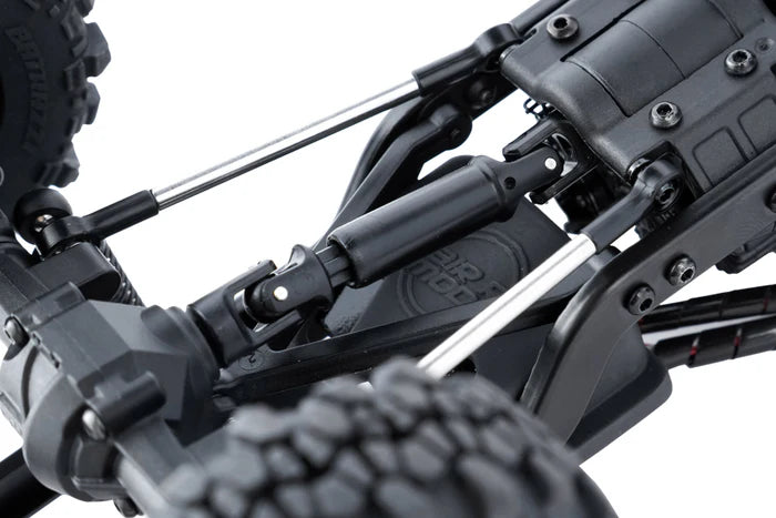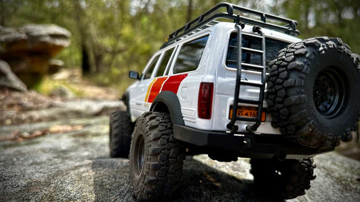 The injection-molded hard plastic body sports a tri-color paint scheme with custom decals, a detailed radiator grille, and a snorkel, capturing the LC80’s rugged aesthetic. Functional headlights, spotlights, and auto-activating turn signals/reverse lights enhance realism, though the lights’ wiring may loosen during heavy bashing. Batrazzi steelie wheels with brass weights and Mud Pro-X tires provide excellent grip, but the soft rubber wears quickly on abrasive surfaces. The 3D-printed rhino bumper and receiver tray add durability, but the absence of scale accessories like ladders reduces visual authenticity compared to earlier models. The clipless body simplifies battery access but may detach during rough tumbles.