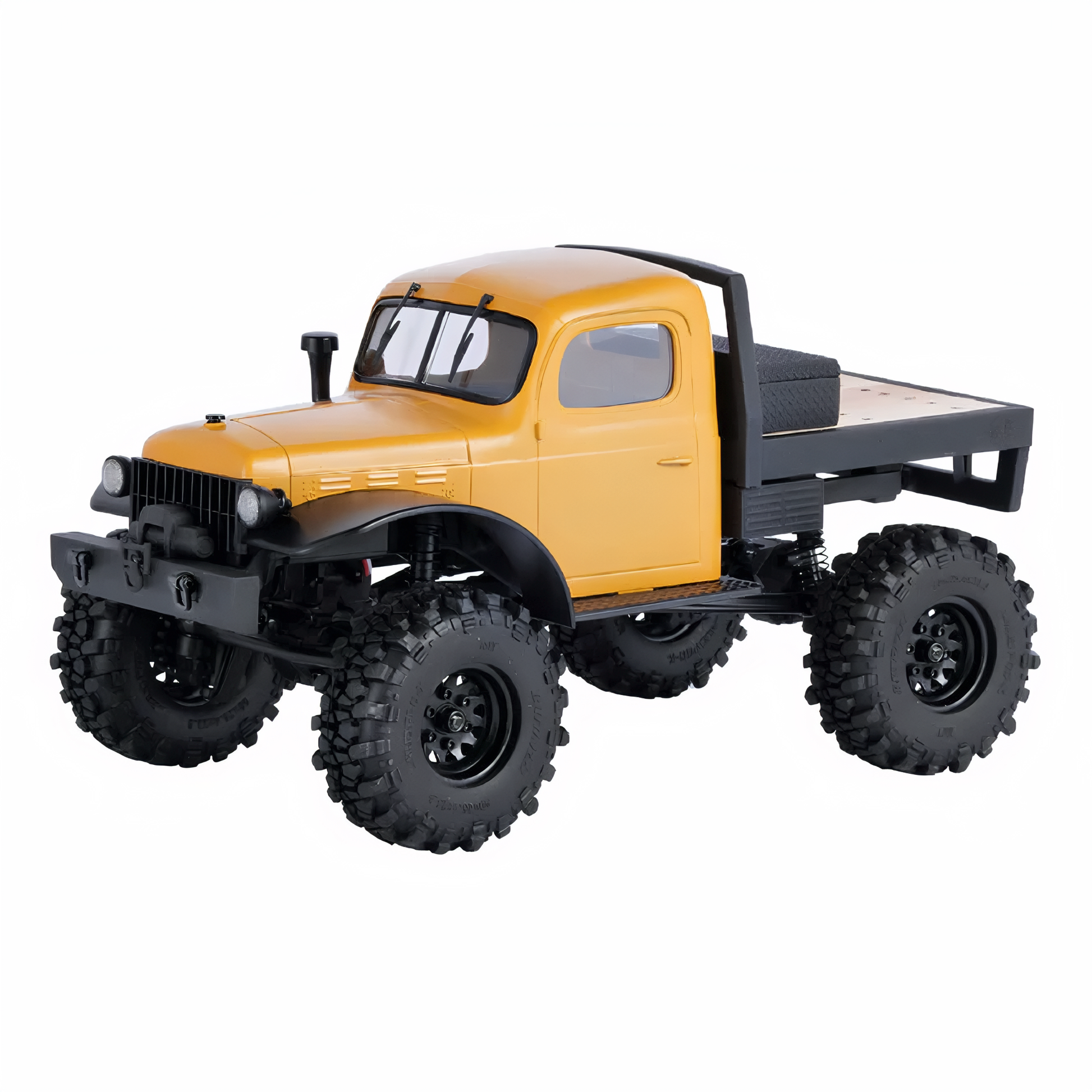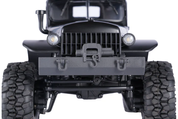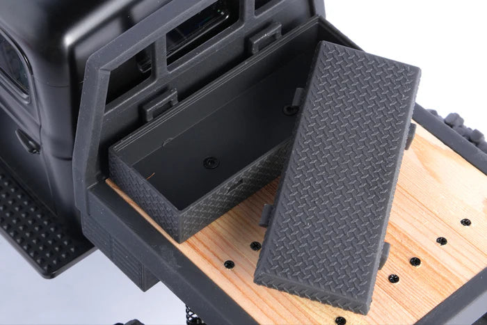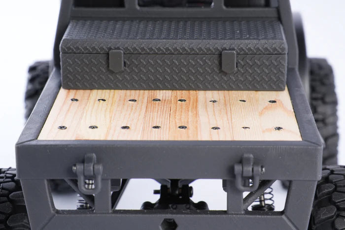 The high-strength nylon frame and metal-gear steering servo contribute to durability, handling moderate impacts during trail use. The handcrafted wooden flatbed, while visually appealing, requires careful handling to avoid damage due to its delicate construction. The polystyrene body withstands light crashes, but prolonged rough use may cause wear on the painted finish or 3D-printed parts like the bumper and toolbox.