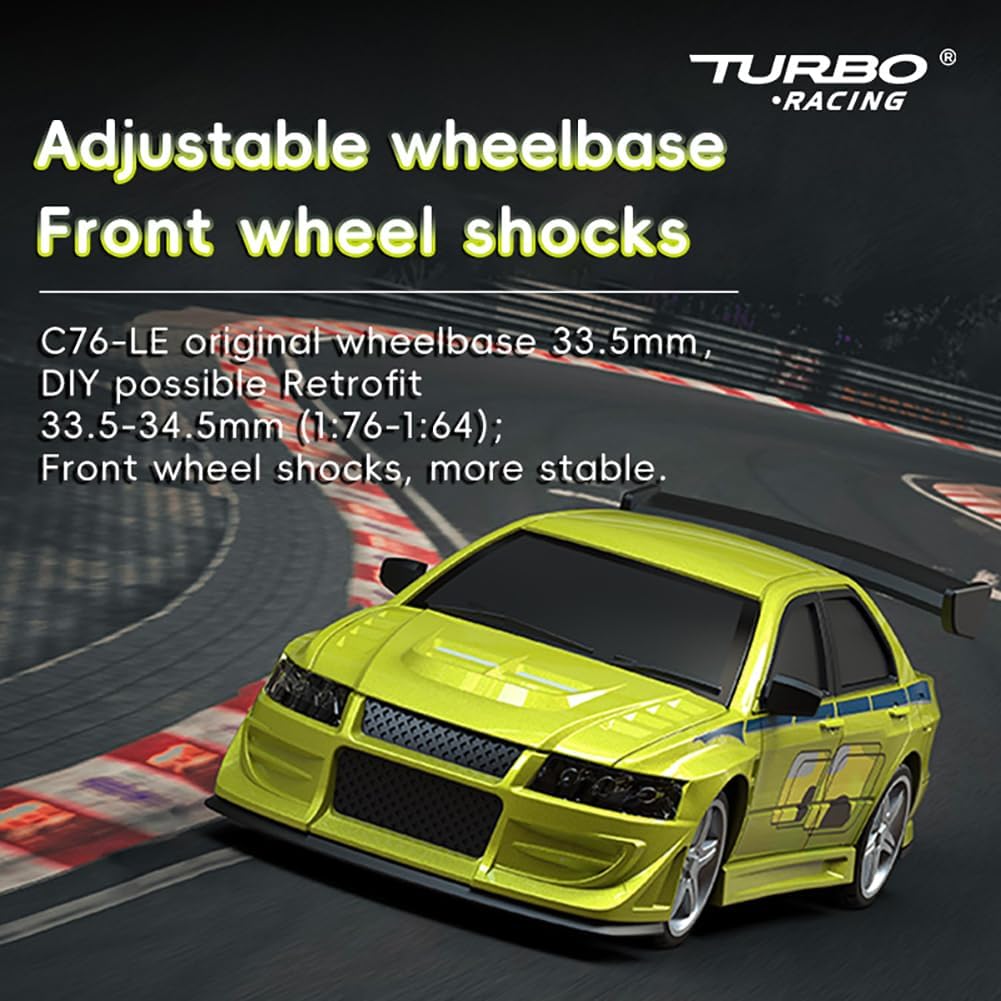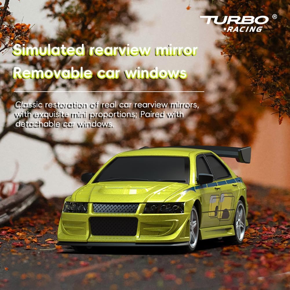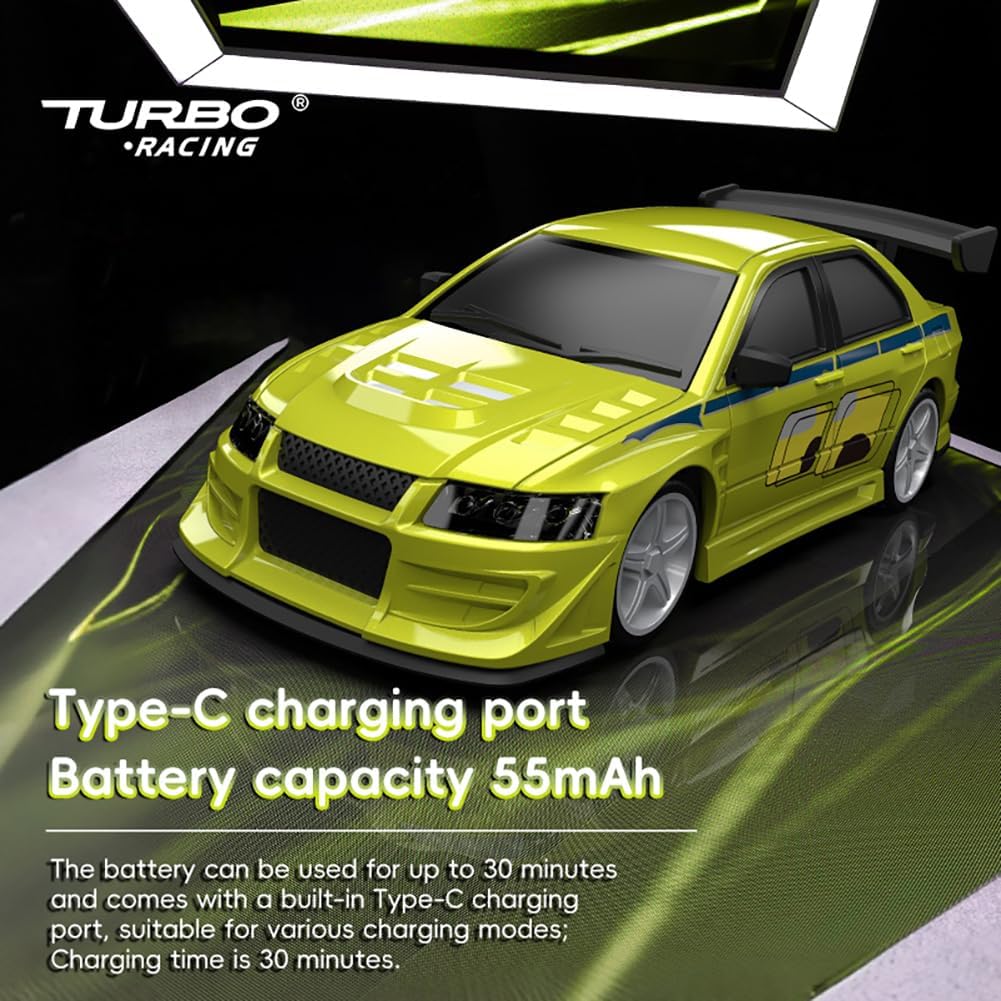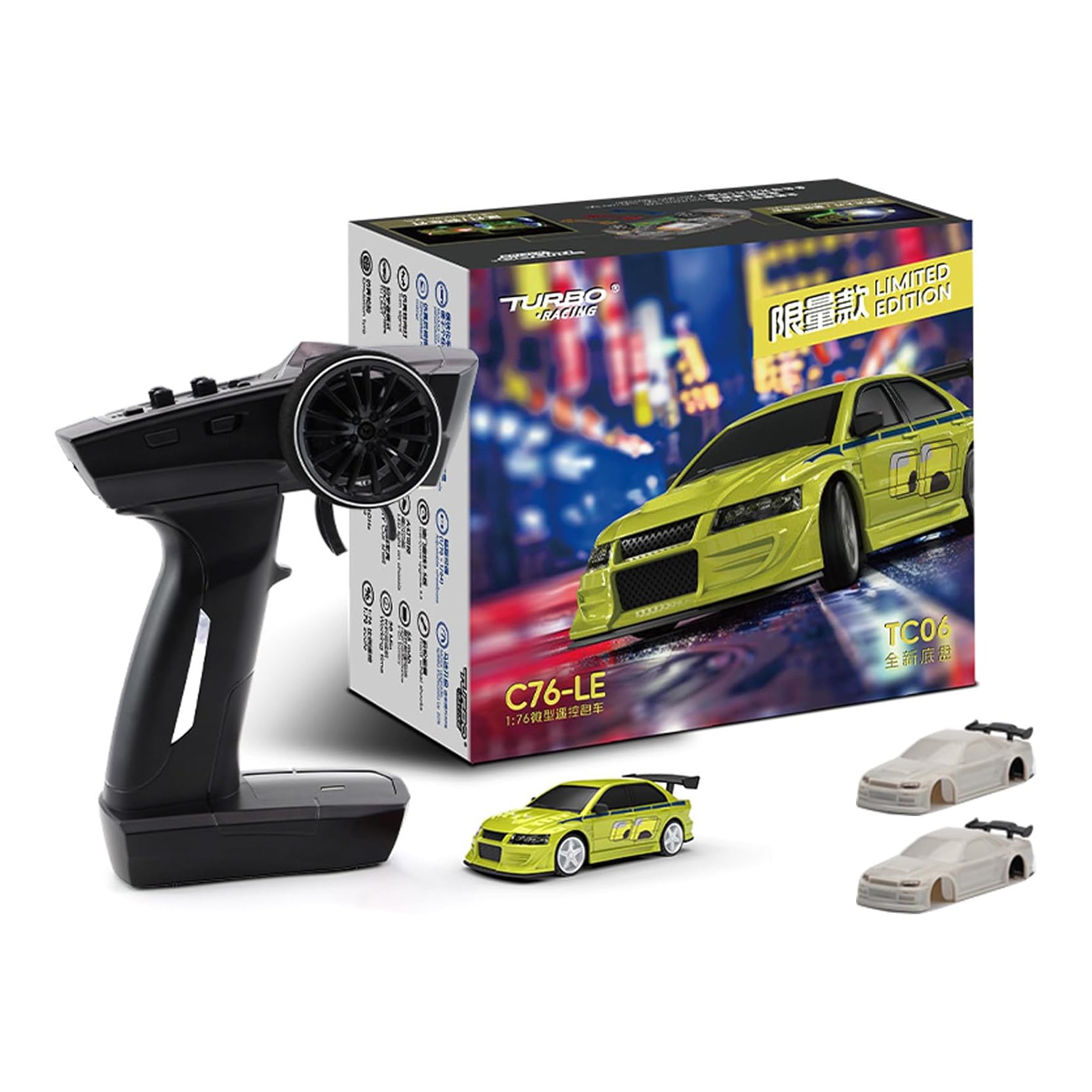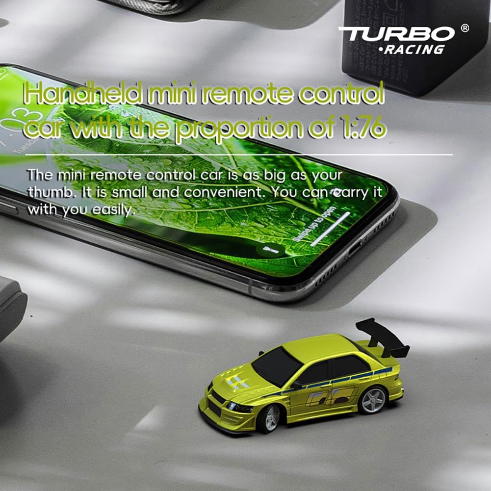 The FLYCOLOR TurboRC 1:76 Mini Sports Car in green is a compact, Ready-to-Run RC model crafted for high-speed indoor fun and customizable flair. With its tiny chassis and two interchangeable body shells, it delivers a mix of portability, style options, and smooth proportional control—perfect for both solo drifting and casual play.