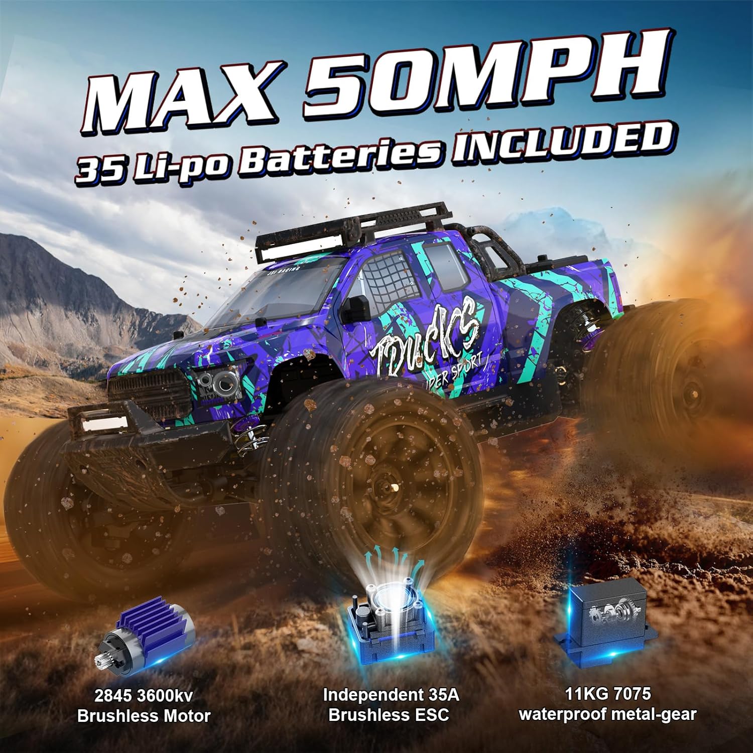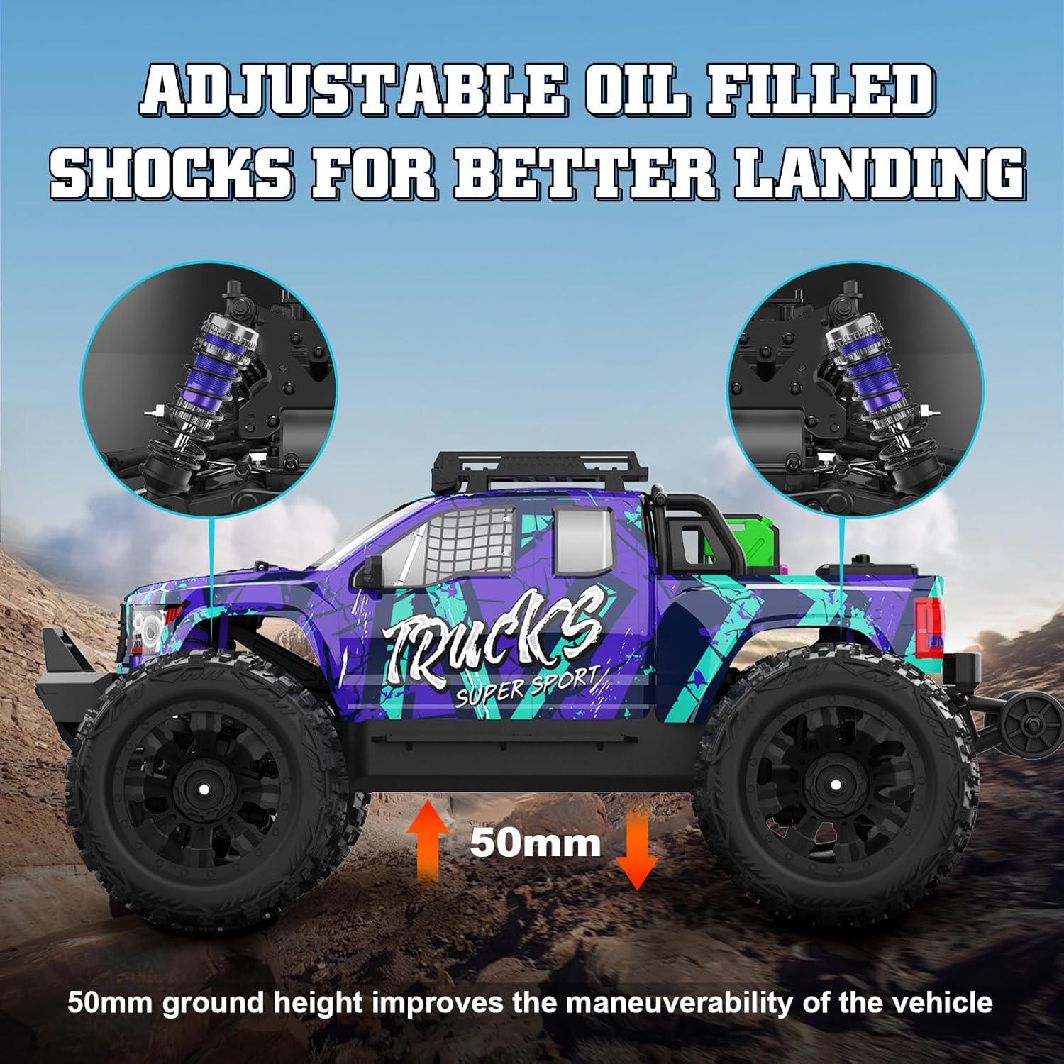 The JIUSI truck reaches speeds up to 70 km/h with a 2847 brushless motor and 35A waterproof ESC, providing strong torque through a 4WD system with metal gear differentials. Oil-filled shocks absorb impacts on rough terrain, but the lightweight 1/16 scale can lead to rollovers during aggressive jumps, requiring careful throttle control. The high-speed setup may cause overheating in the motor or ESC during extended runs, and the stock tires struggle with traction on wet surfaces, leading to occasional sliding. The 2.4GHz remote ensures reliable control up to 100 meters, supporting multi-vehicle racing.