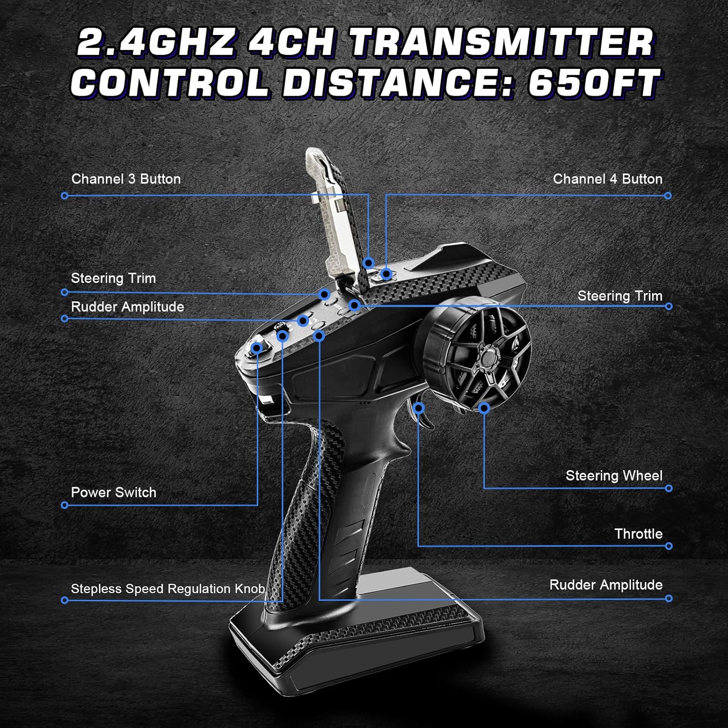 - Transmitter: 2.4GHz pistol-grip with proportional control, 100m range.