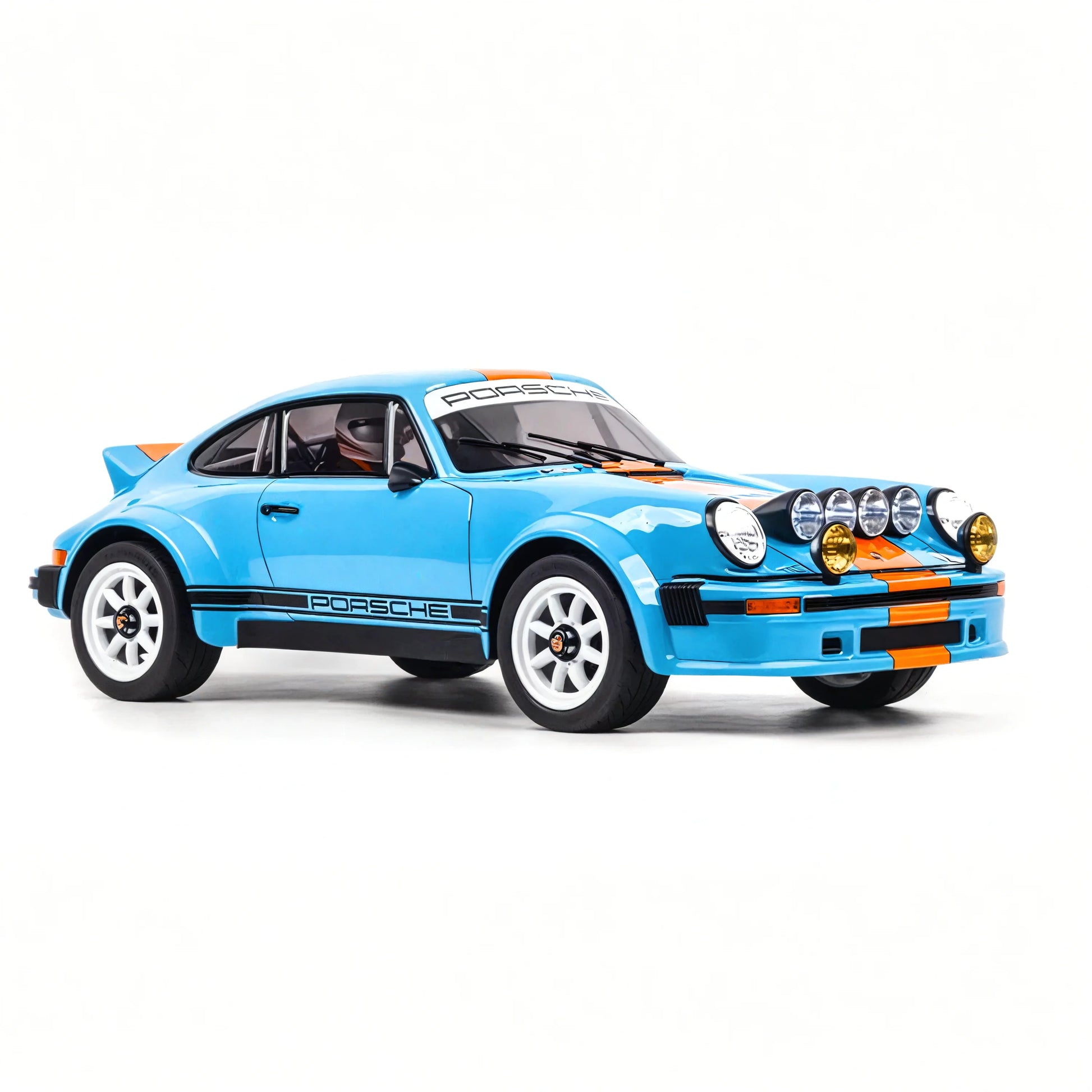 The KM 934 is a commanding 1/6 scale brushless off-road rally RC vehicle with styling that closely mimics the iconic Porsche 911 silhouette. Its design combines classic European rally aesthetics with modern RC performance, all wrapped in a rugged frame built for real-world terrain.