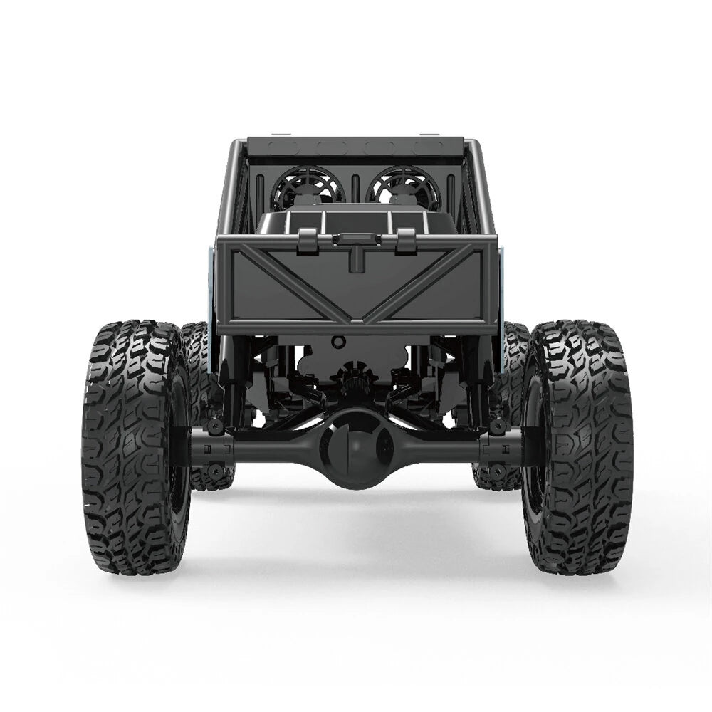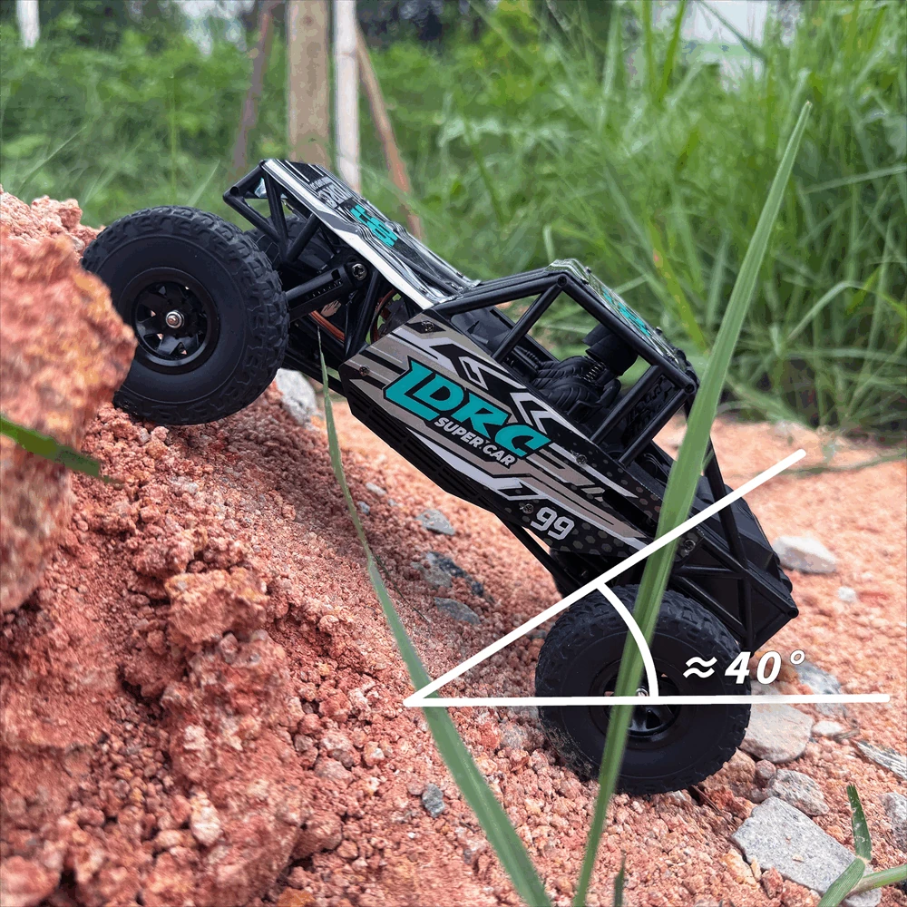 The LDRC 18499 features a 280 high-speed brushed motor and a 10A ESC, providing steady power for climbing over rocks, dirt, or small obstacles. The 4WD system with straight bridge axles provides consistent torque, handling uneven surfaces like gravel or tabletops effectively. Spring suspension and an eight-link chassis aid stability, though the small scale limits performance on extreme inclines compared to larger crawlers. Battery life supports about 25–30 minutes of runtime, sufficient for short sessions.