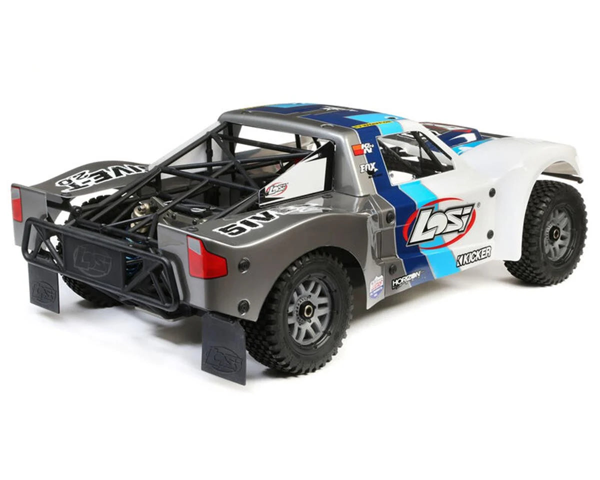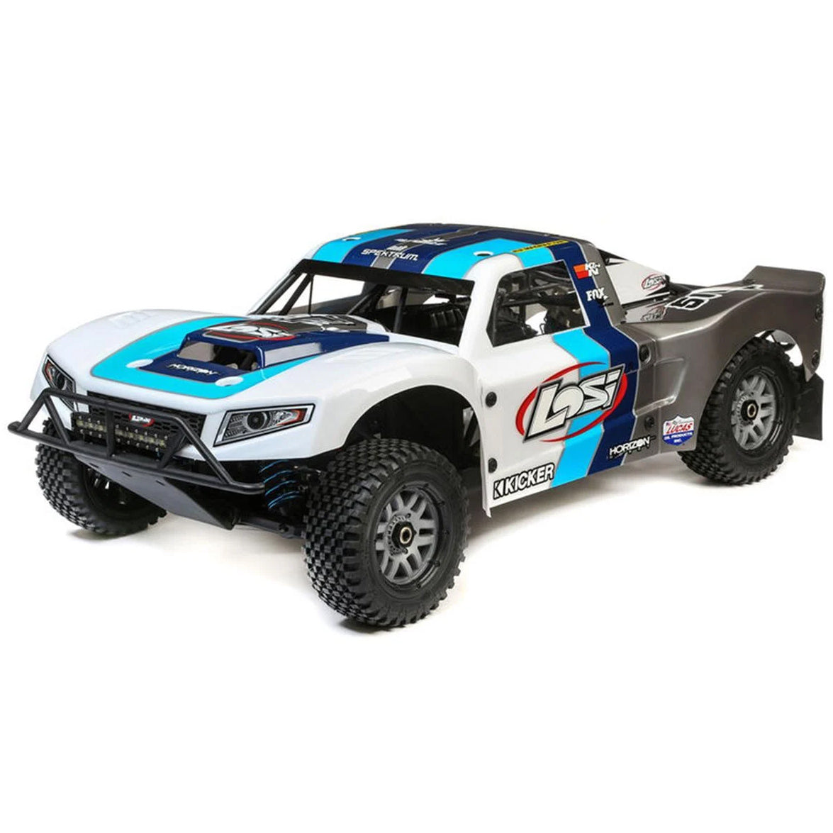 The pre-painted grey/blue/white body features a redesigned hood with a scoop and raised fenders for increased wheel clearance, paired with high-grip tires for a bold short course aesthetic. The 4mm 6061-T6 aluminum chassis ensures durability, while hard-anodized shock bodies with bleeder caps enhance suspension performance. Extensive aftermarket support allows upgrades like performance pipes or metal gears, but the polycarbonate body may show scratches after intense bashing. The lack of included LED lights reduces nighttime visibility, though aftermarket options are available. Waterproofing is limited, so caution is advised in wet conditions.