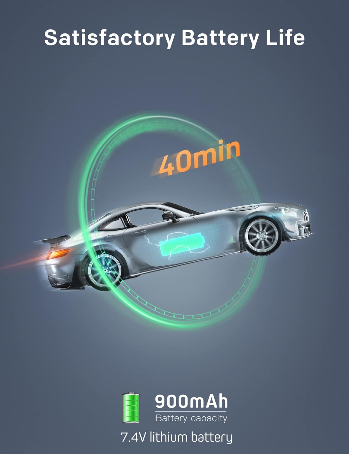 Powered by a 7.4 V lithium battery (900 mAh), this model reaches a top speed of around 12 km/h under ideal conditions. The 2.4 GHz radio system offers responsive throttle and steering, giving drivers good control whether cruising or pushing the car’s limits.
