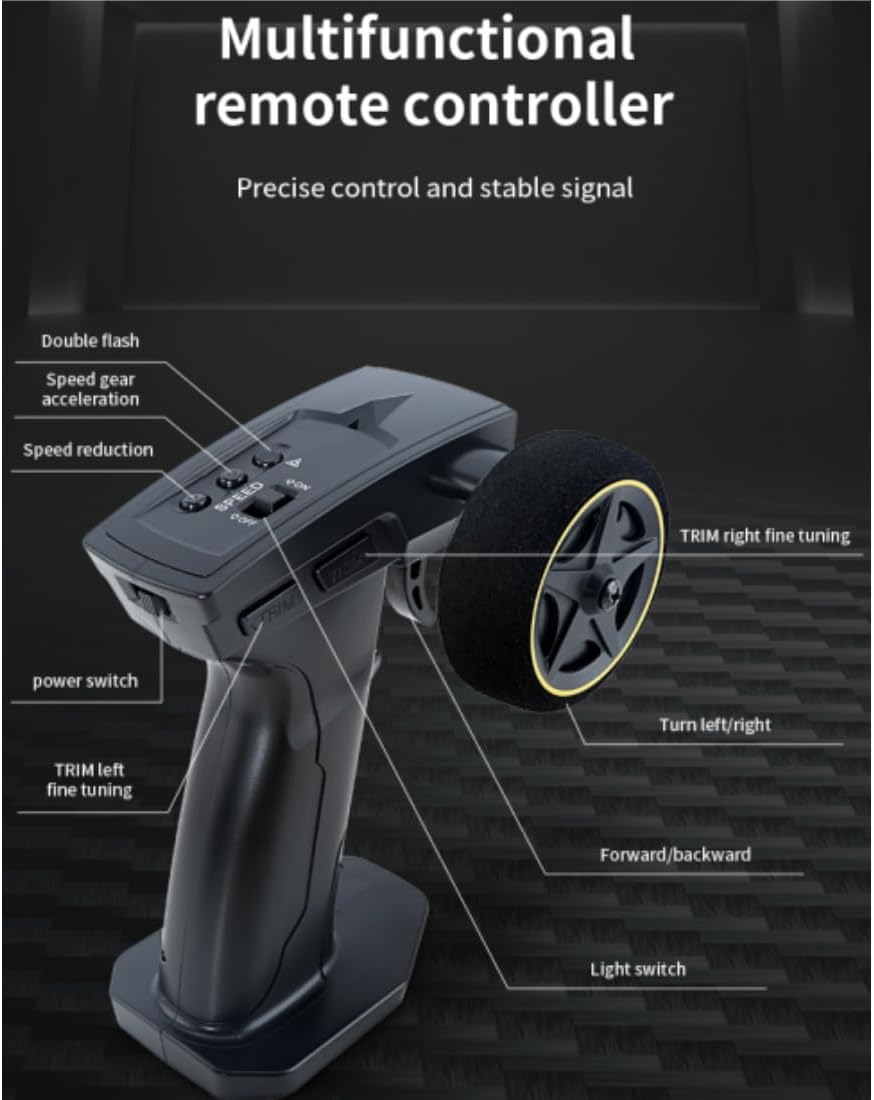 - Transmitter: 2.4GHz with three-speed throttle (20%/50%/100%).