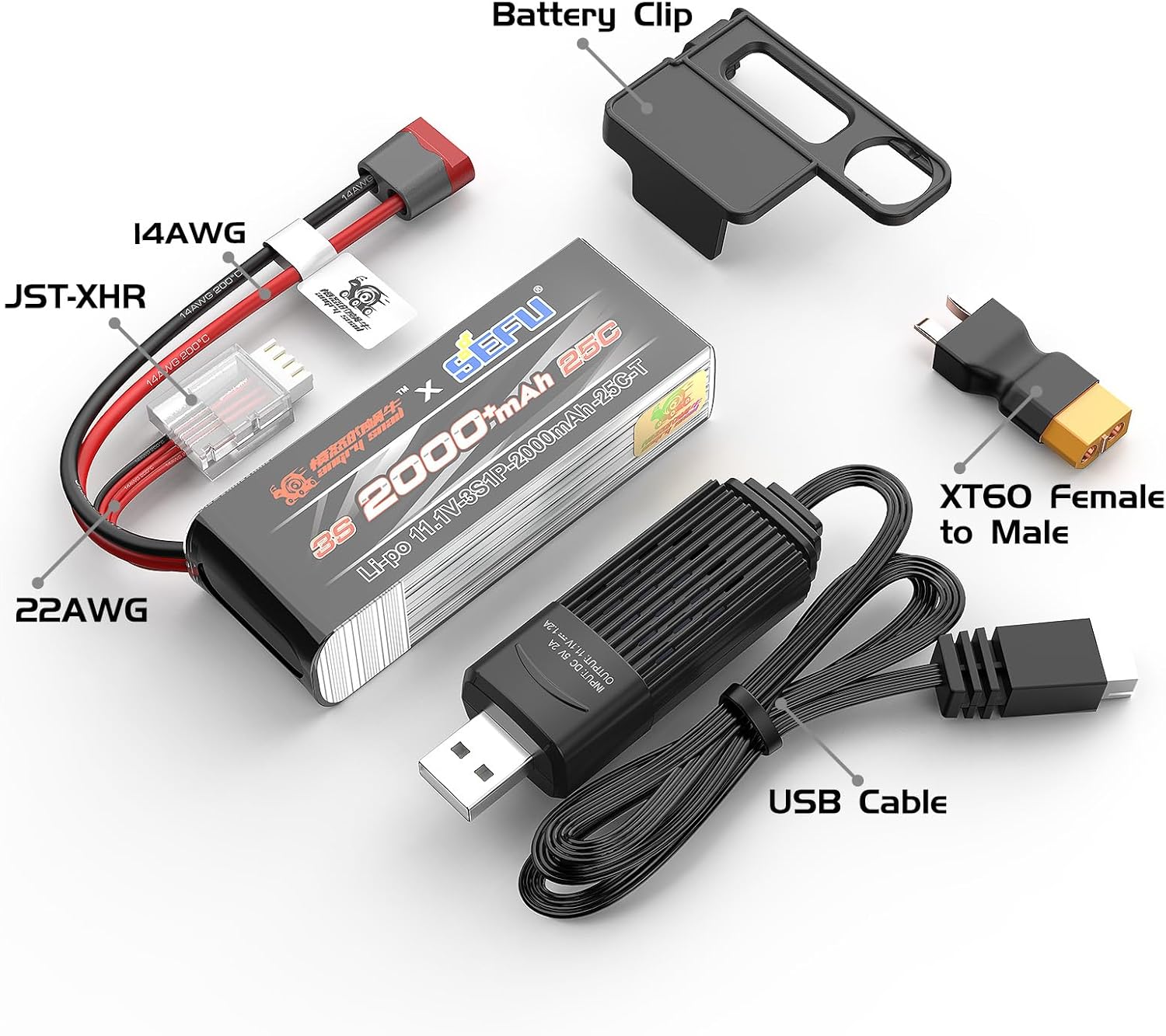 - Battery: Two 7.4V 2000mAh 2S, one 11.1V 2000mAh 3S LiPo, ~20–30-minute runtime.