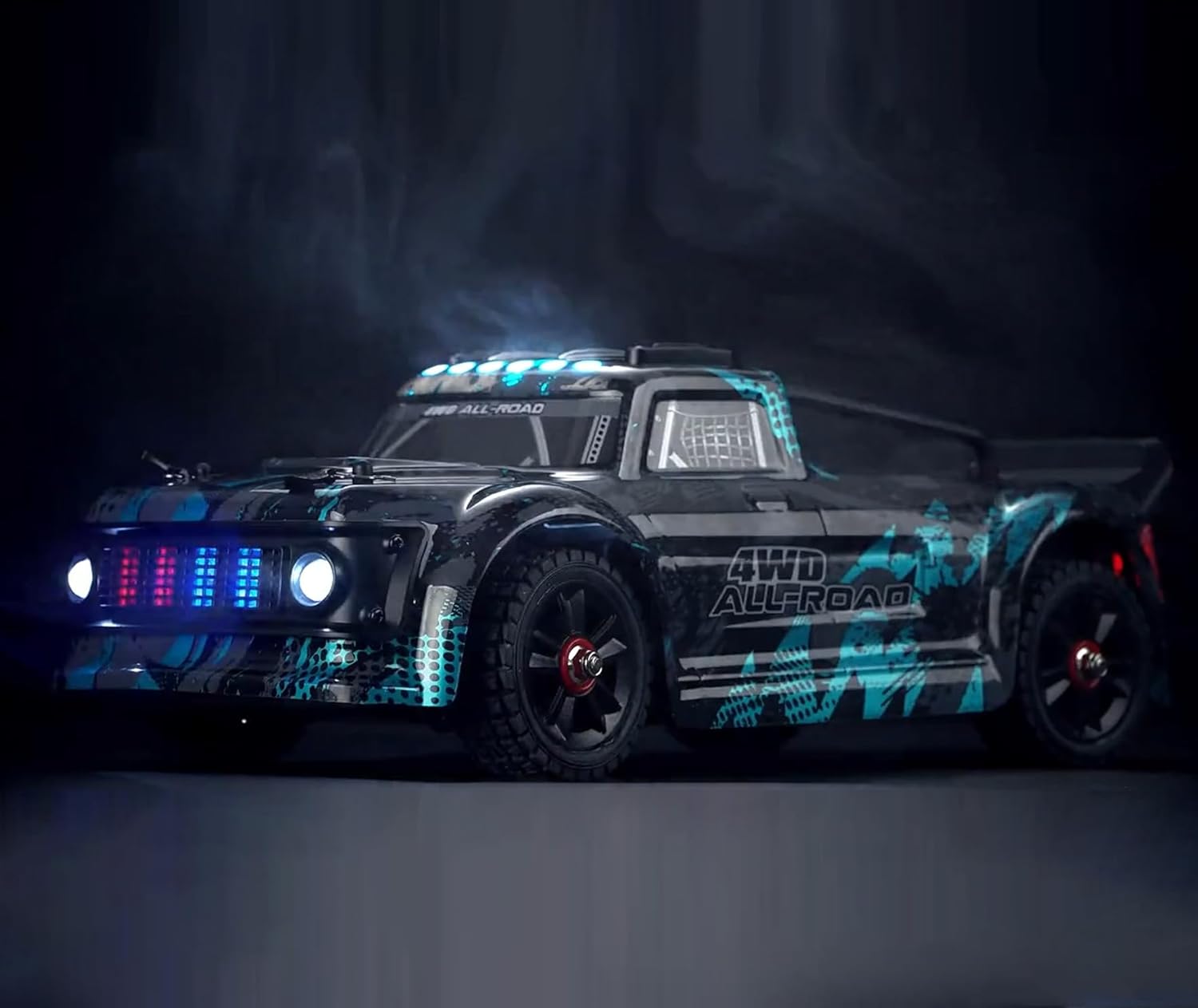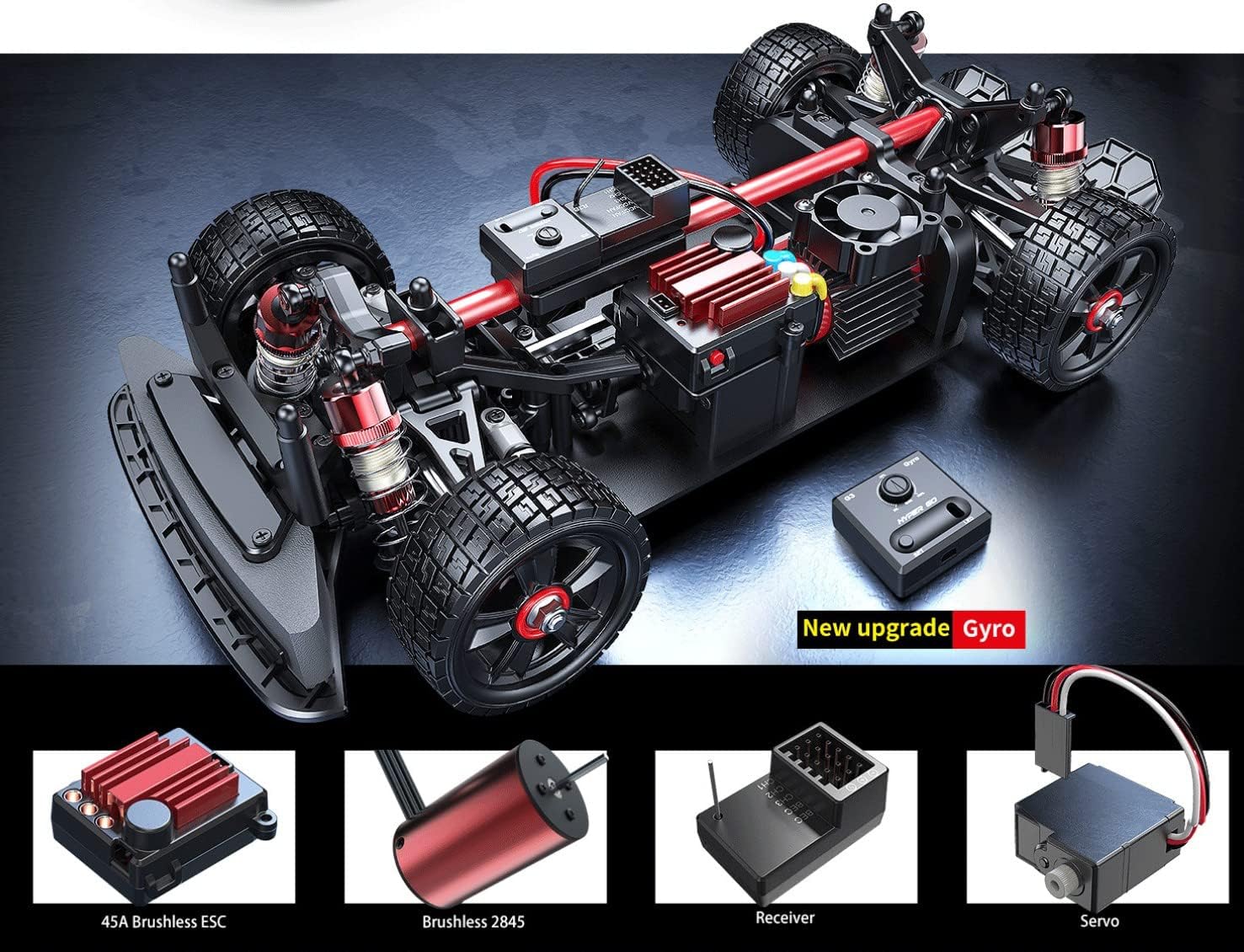 The 2845 3700KV brushless motor and 45A ESC power the car to speeds up to 42 km/h on a 7.4V 2000mAh LiPo battery. The 4WD system with steel driveshafts and metal diff gears ensures smooth handling on pavement, while the adjustable gyro helps with precise drifting. Threaded hydraulic shocks absorb bumps, but some users note the ESC may overheat without a cooling fan during long runs. The included drift and off-road tires let you switch terrains, though grip can be low on wet surfaces.