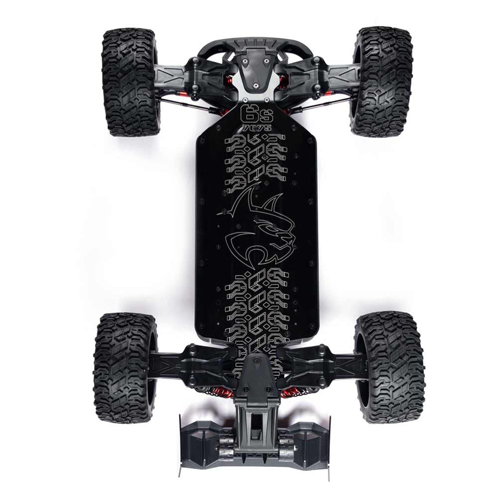 The Machete 6S features a cab-forward, non-specific monster truck body in black polycarbonate, complete with hard plastic skid plates and body armor for durability in harsh conditions. The 4mm black-anodized 7075 aluminum chassis and high-strength plastic components, including shock towers and A-arms with captured mounts, ensure structural integrity. The all-terrain directional tires balance grip and wear, suitable for diverse surfaces. The absence of included LED lights limits nighttime visibility, though aftermarket kits are compatible. The polycarbonate body may scratch during aggressive bashing, but its flexibility withstands impacts in varied climates. Extensive aftermarket support offers upgrades like metal gears or performance tires for enhanced durability.