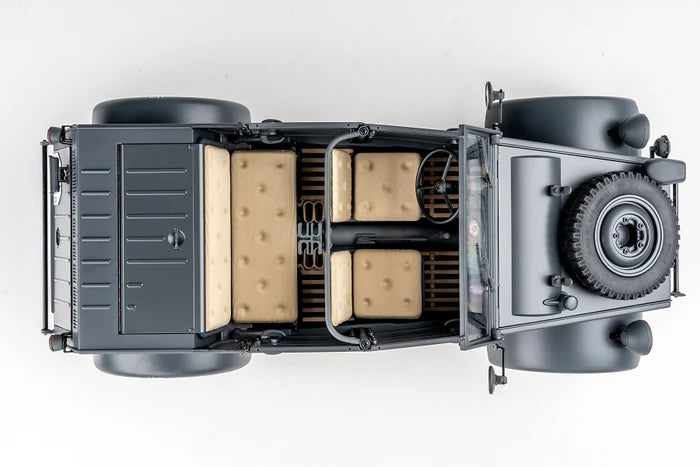The model replicates the WWII-era Kubelwagen Type 82, complete with licensed-style bodywork, openable doors, mechanical locks, and a retractable windscreen. It features functional elements such as soft fabric seats, a spare tire, and realistic 5.25-16 tires. Other details include angle-adjustable rear-view mirrors, a front and rear bumper, and lighting functions for both daytime detail and low-light visibility.