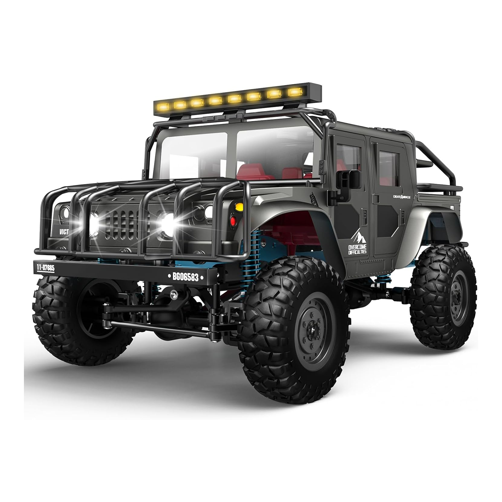 The black polycarbonate body, accented with vibrant graphics, includes functional LED headlights and turn signals for enhanced realism and nighttime visibility. The alloy steel frame and metal cooling fins ensure structural integrity, while the shock-absorbing suspension smooths rough terrain. The body may show scratches during aggressive use, but the roll bar system minimizes damage. Aftermarket upgrades, like metal axles, are available for customization. The IPX4 rating allows light water exposure, though submersion is not advised.
