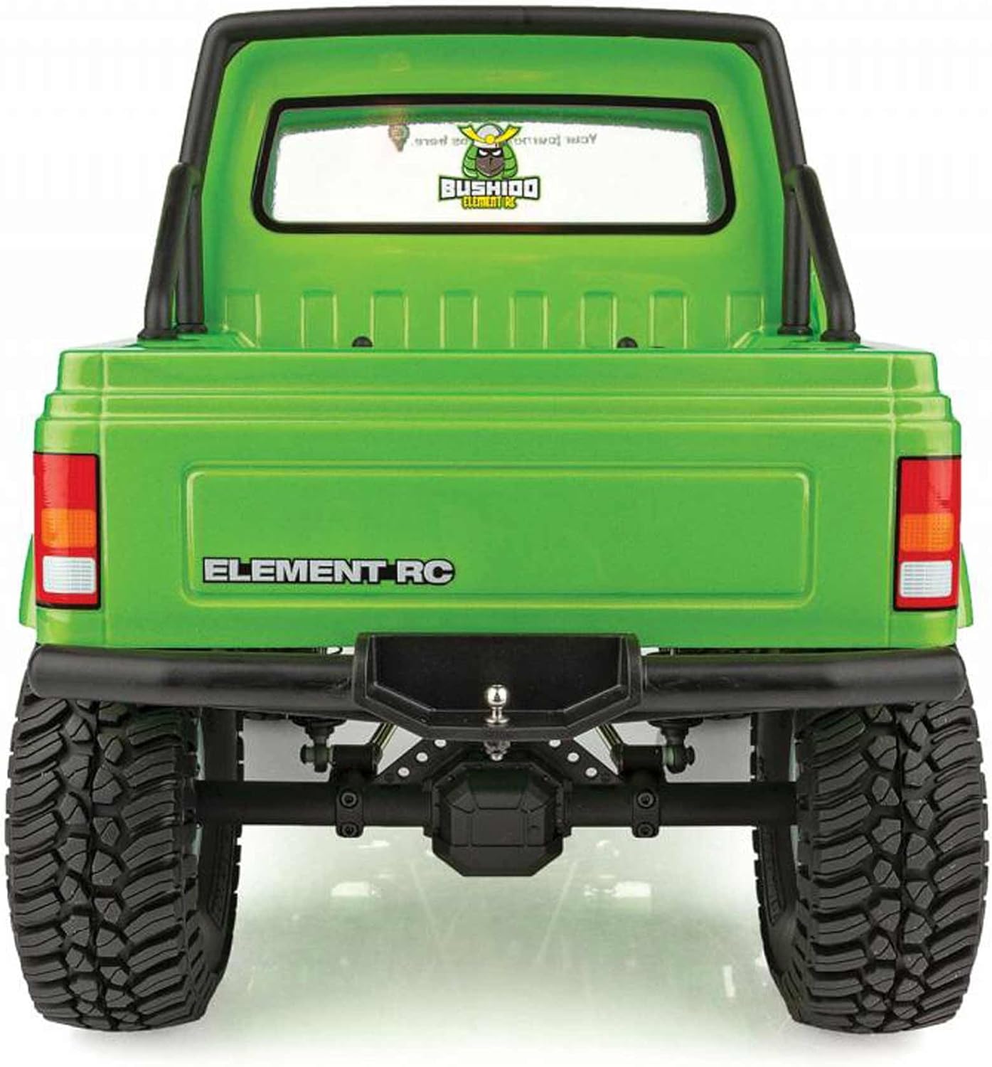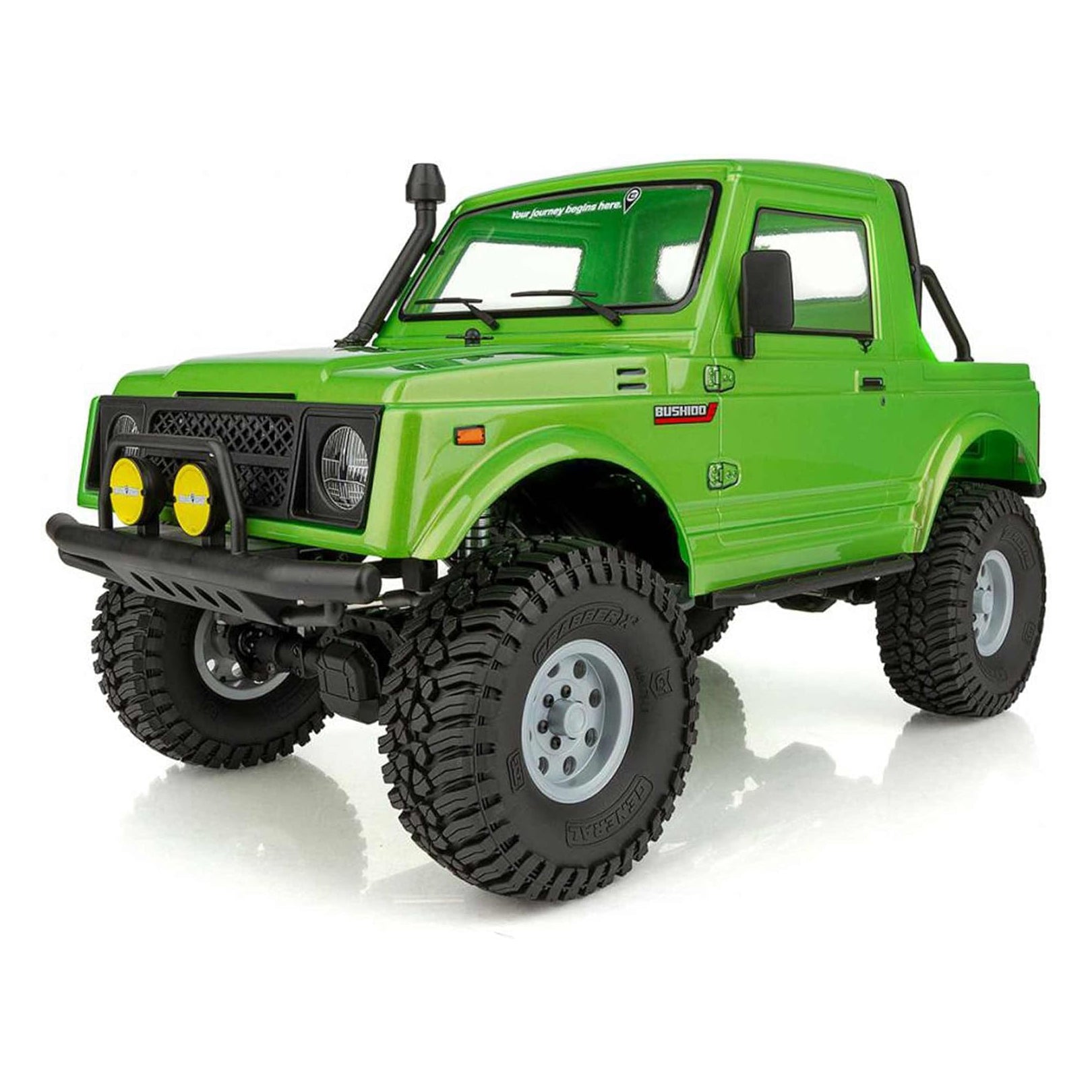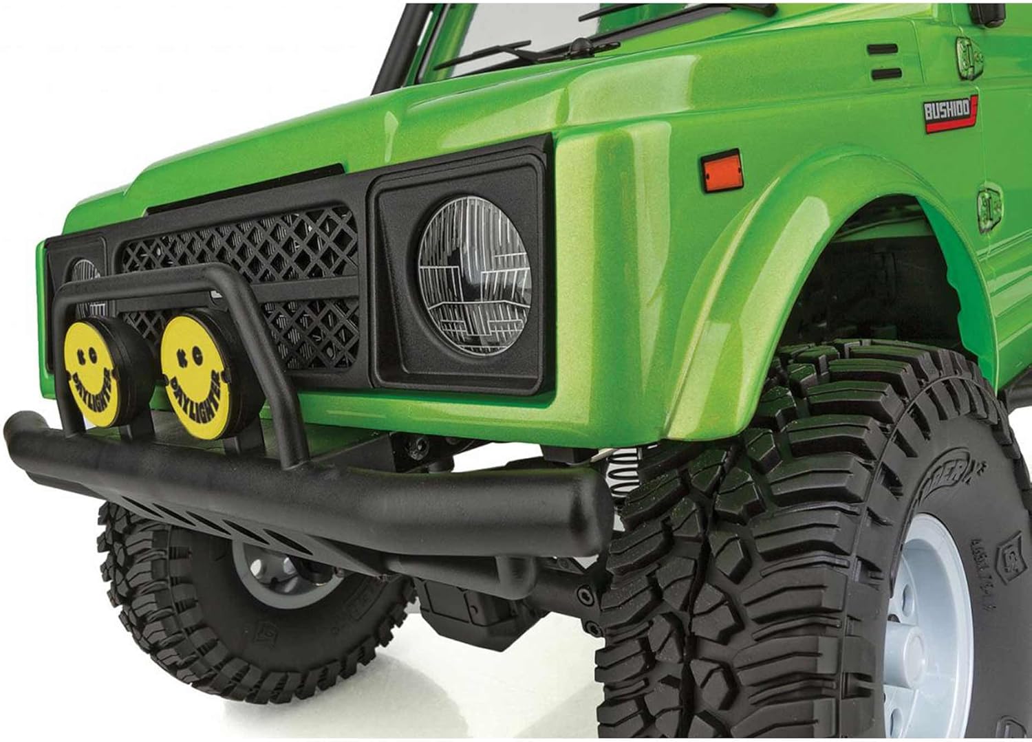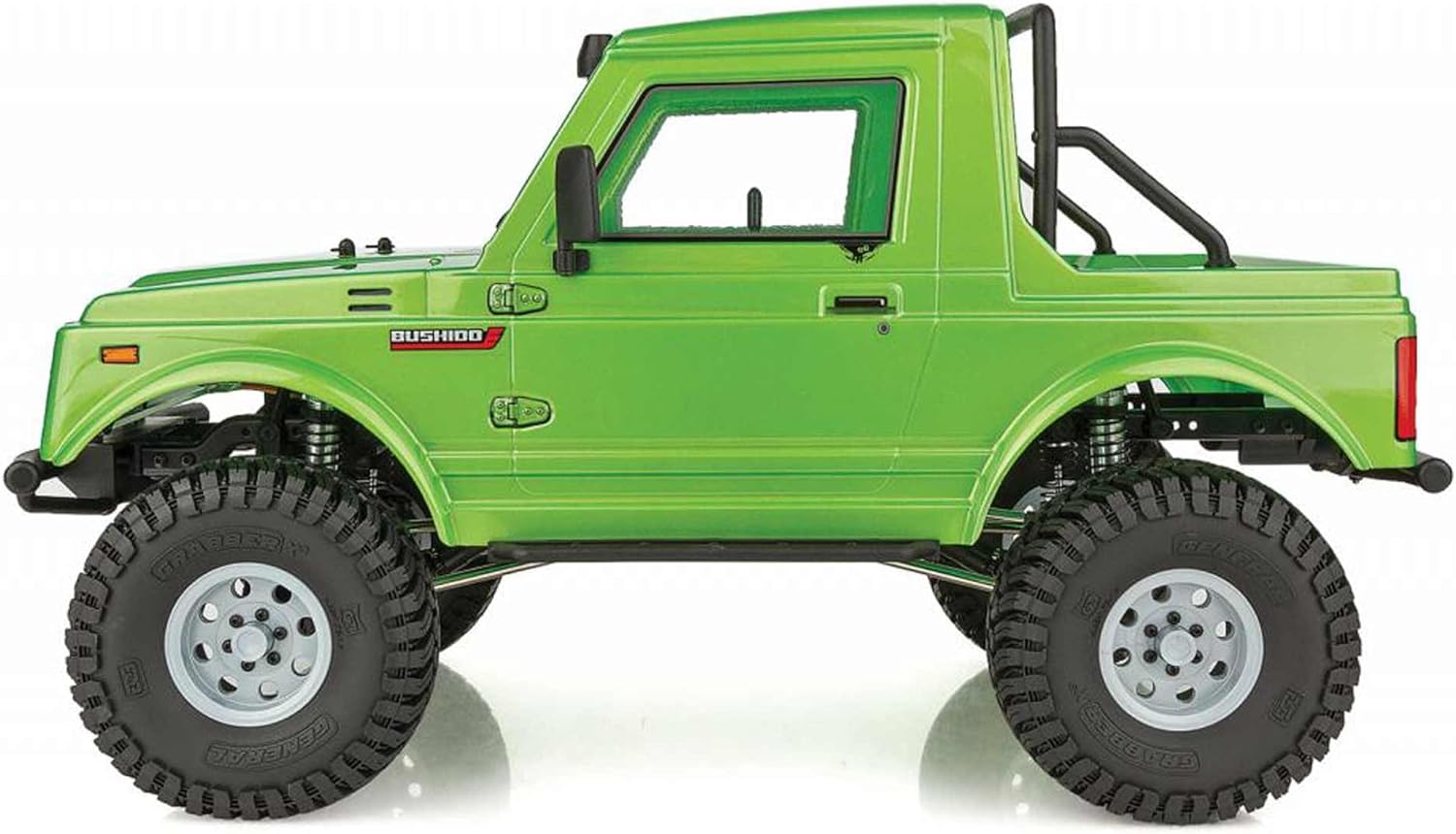 The Team Associated Enduro Bushido 1/10 4WD Ready-to-Run Trail Truck in green is an RC rock crawler inspired by the Suzuki Samurai’s compact 1980s 4x4 kei car design. This trail truck features a detailed polycarbonate body, a Stealth X gearbox, and a LiPo battery combo, offering functionality for off-road trails. Its scale, realism, and durable chassis make it suitable for hobbyists interested in scale RC cars and outdoor crawling.
