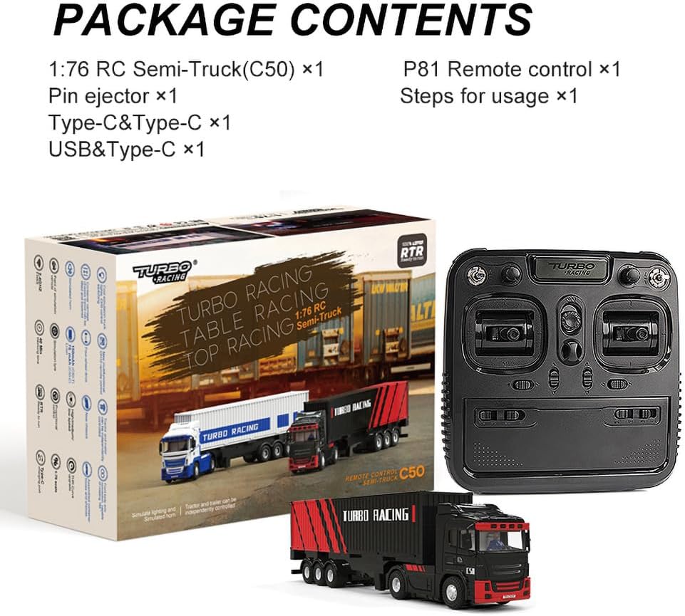 The Turbo Racing C50 1:76 4WD Ready to Run delivers a detailed micro RC truck experience with a tractor-trailer design for indoor or smooth-surface play. Featuring a 4WD tractor with a detachable trailer, multiple LED lights, and realistic sound effects, this model offers scale realism and functionality. Equipped with a P81 10CH 2.4GHz transmitter and dual Type-C charging batteries, it suits scale RC car enthusiasts seeking a compact, feature-rich vehicle.