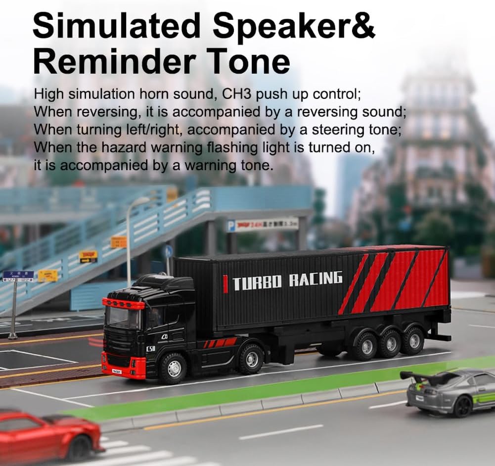 The black-red tractor body features high-simulation LED lights, including low/high beam headlights, grille lights, roof lights in four colors, fog lights, brake lights, and turn signals, enhancing visual appeal. The trailer includes matching tail, fog, and brake lights, with a support frame that adjusts for detachment, mimicking real tractor-trailer mechanics. Realistic sounds (horn, reversing, turning, warning lights) add immersion, controllable via CH6, but the volume may be faint in noisy environments. The plastic body, while detailed, is prone to scratches during crashes, and the small scale limits durability under rough handling. The inclusion of two containers adds play versatility, though their small size requires careful storage to avoid loss.