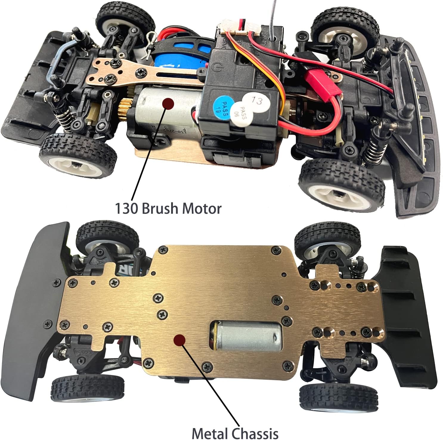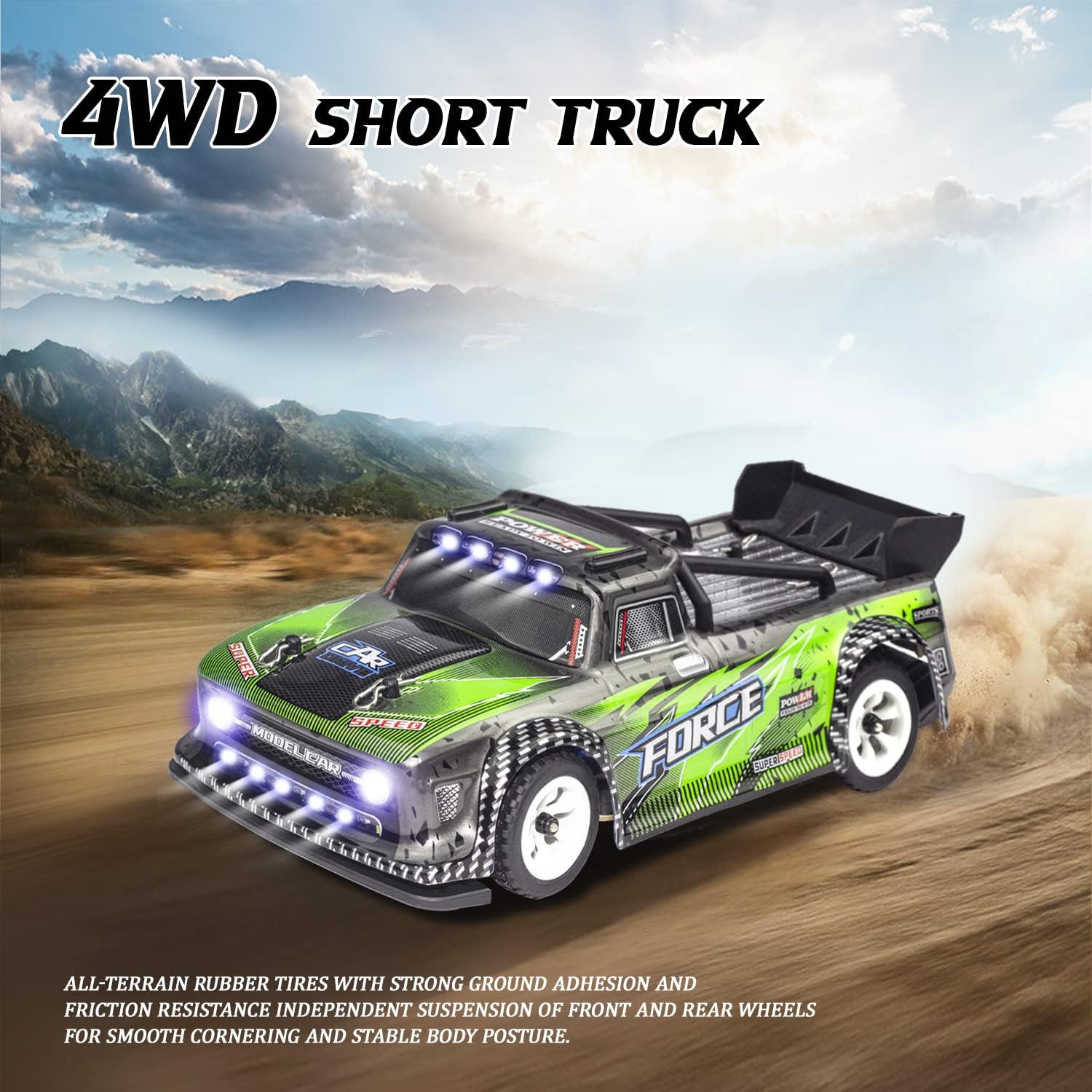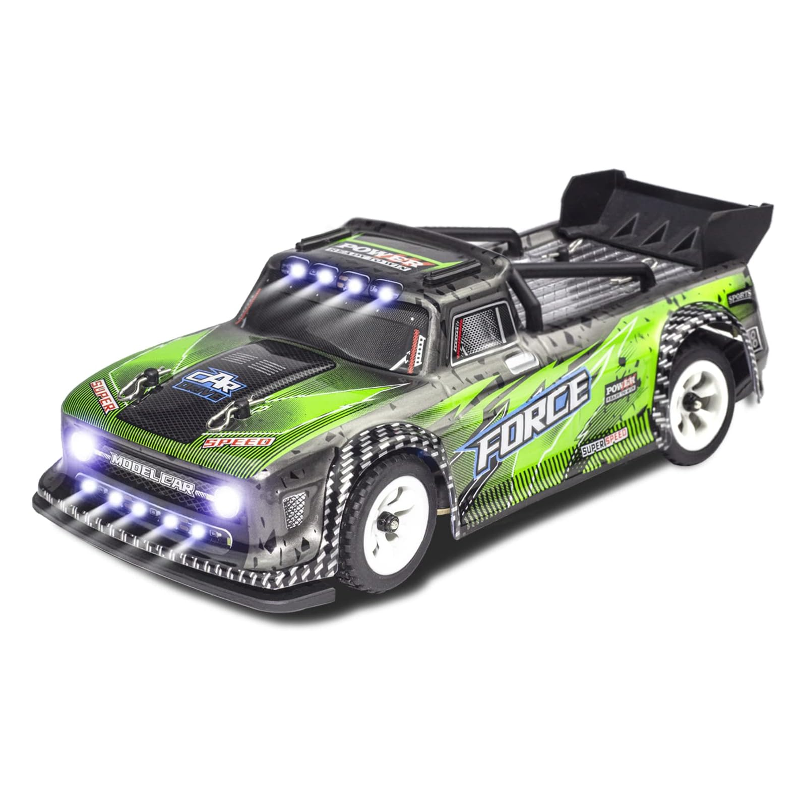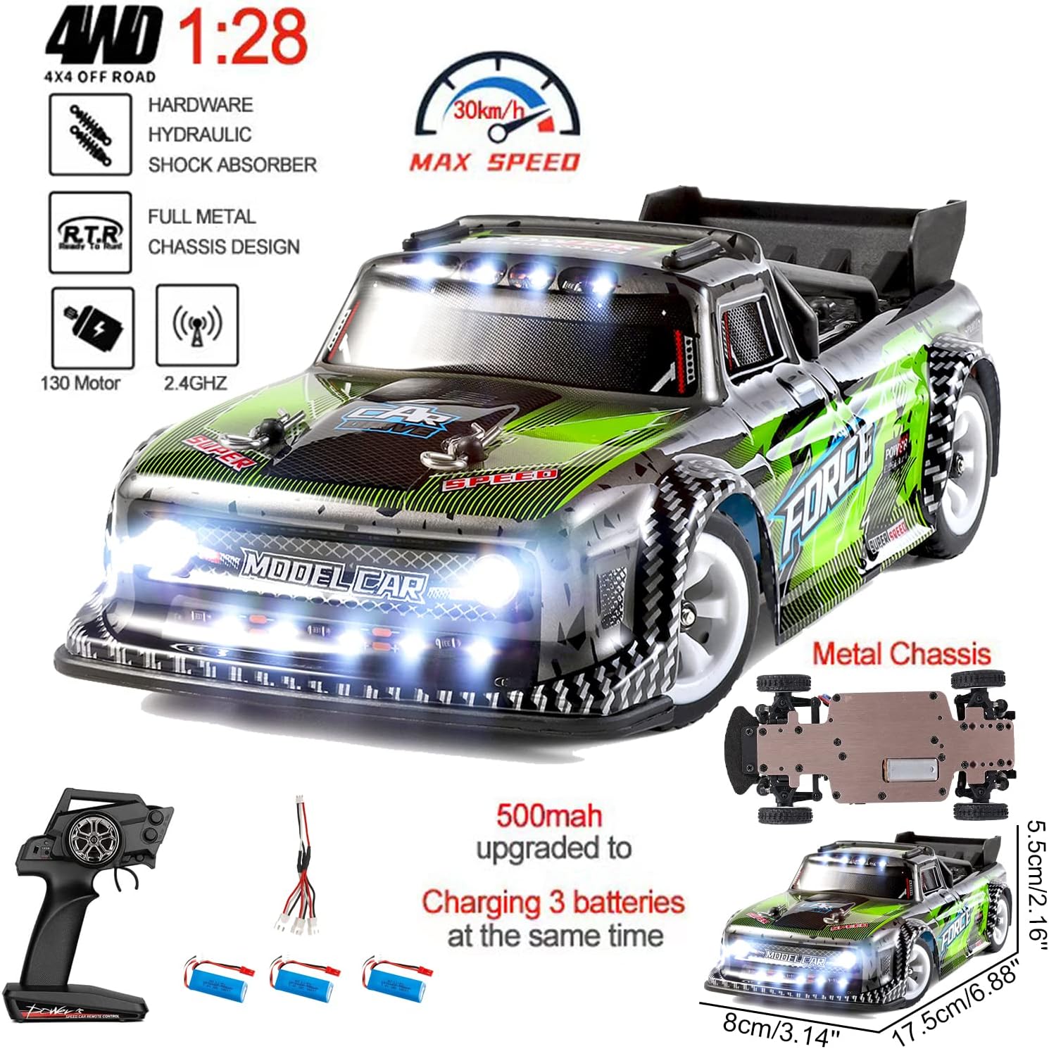The WLtoys 284131 1/28 4WD Ready to Run offers a compact mini RC drift car designed for high-speed drifting and on-road performance. Featuring a metal chassis, pre-installed drift tires, and functional LED lights, this vehicle provides a balance of durability and visual appeal. Equipped with a 2.4GHz remote control system and three 7.4V 500mAh batteries, it supports extended play for micro RC car enthusiasts seeking indoor or smooth-surface racing.