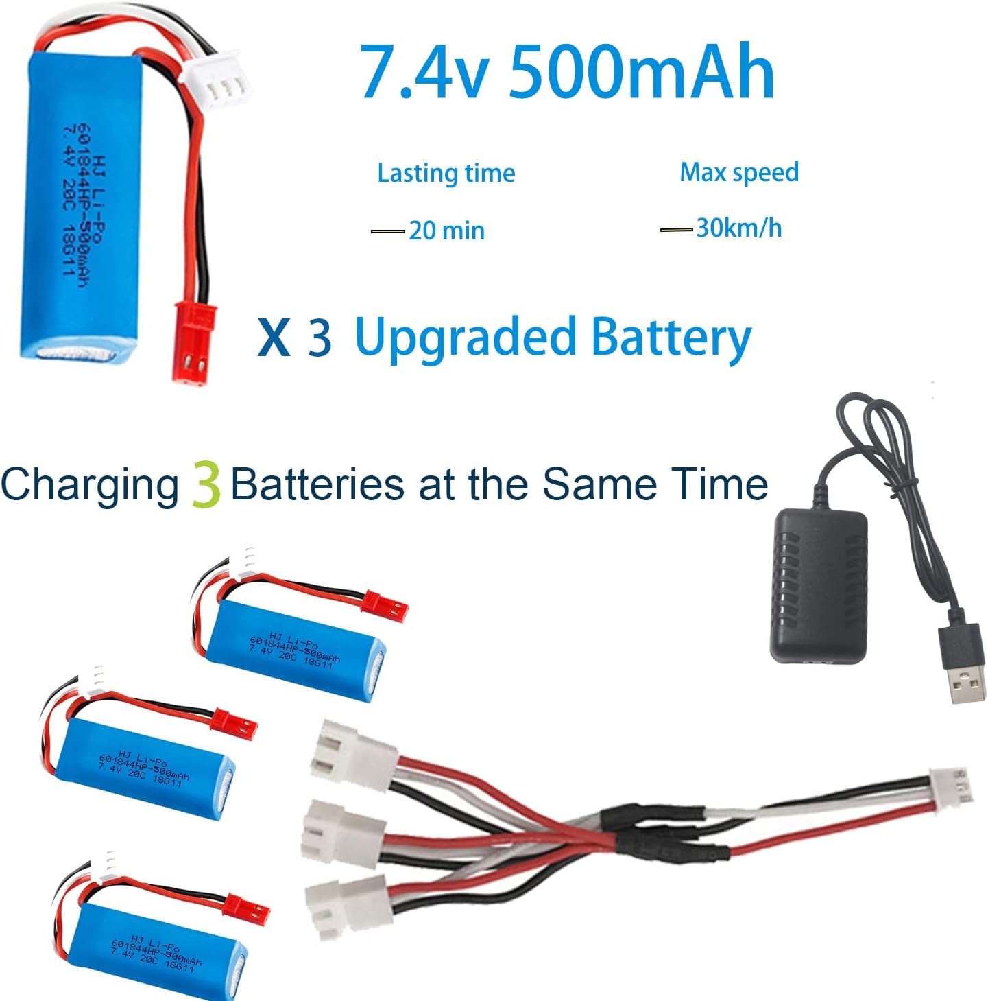 - Battery: Three 7.4V 500mAh LiPo batteries, ~12–18 minutes runtime each, USB charging.