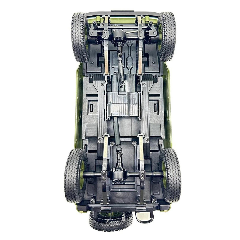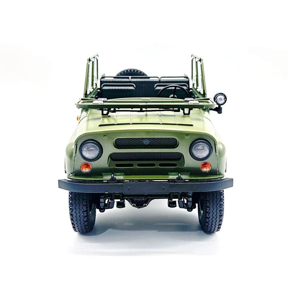 The model is officially licensed and features authentic UAZ-469 styling: realistic body lines, a removable canopy, foldable windshield, and removable window frame — giving it a collector-friendly, scale-accurate appearance. The front engine bay doubles as the battery compartment, preserving the scale look while making maintenance easier.